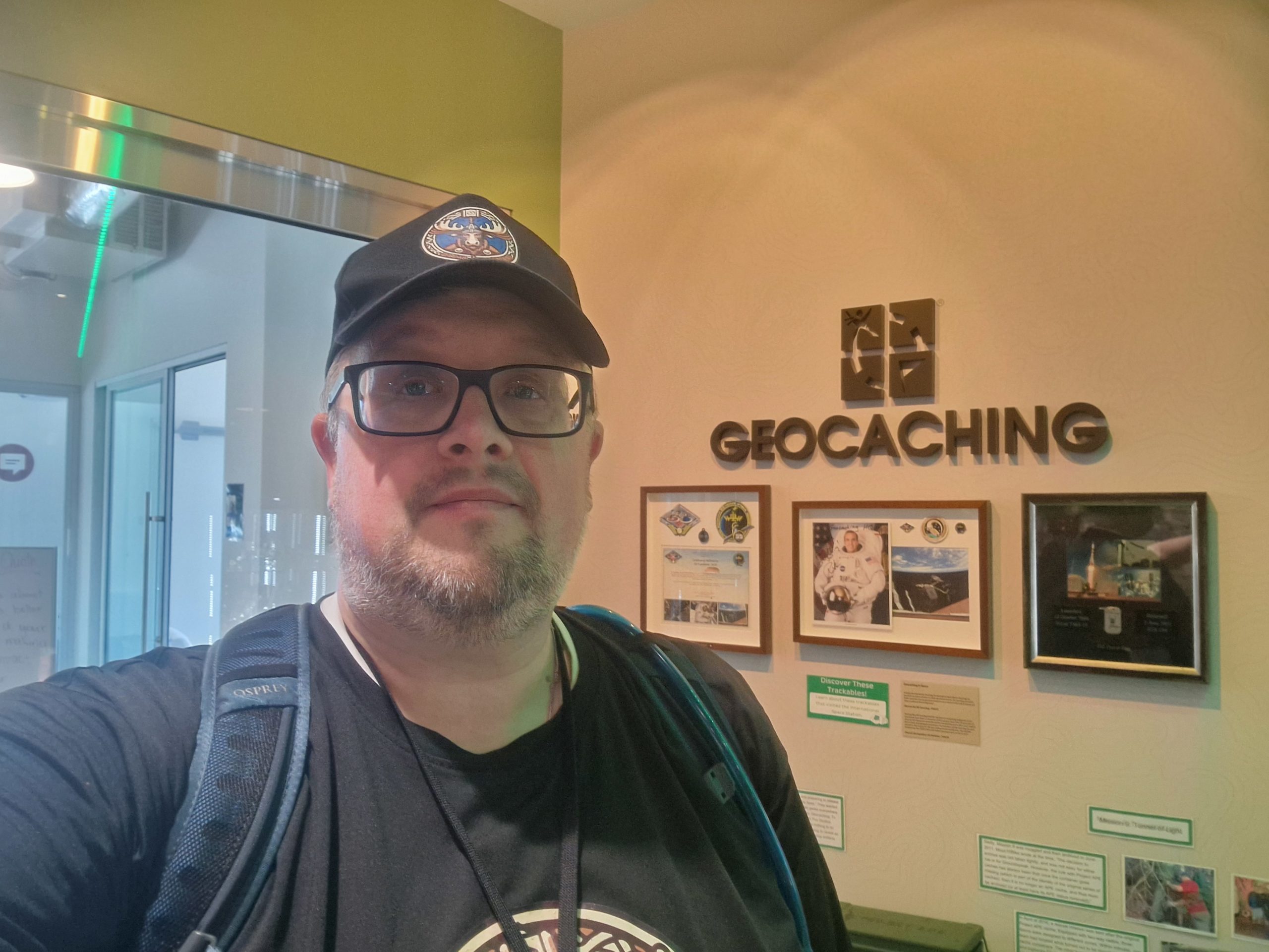 At HQ, I ran into the Czechs once more – they seemed convinced they were the stars of the day – but I focused on my visit: stamping the Geotour passport, taking photo booth pictures, logging travel bugs and coins, and picking up memorabilia. I bought the Geotour coin, the trifecta coin, an HQ coin, stickers, and a t-shirt a friend in Calgary had asked for.
